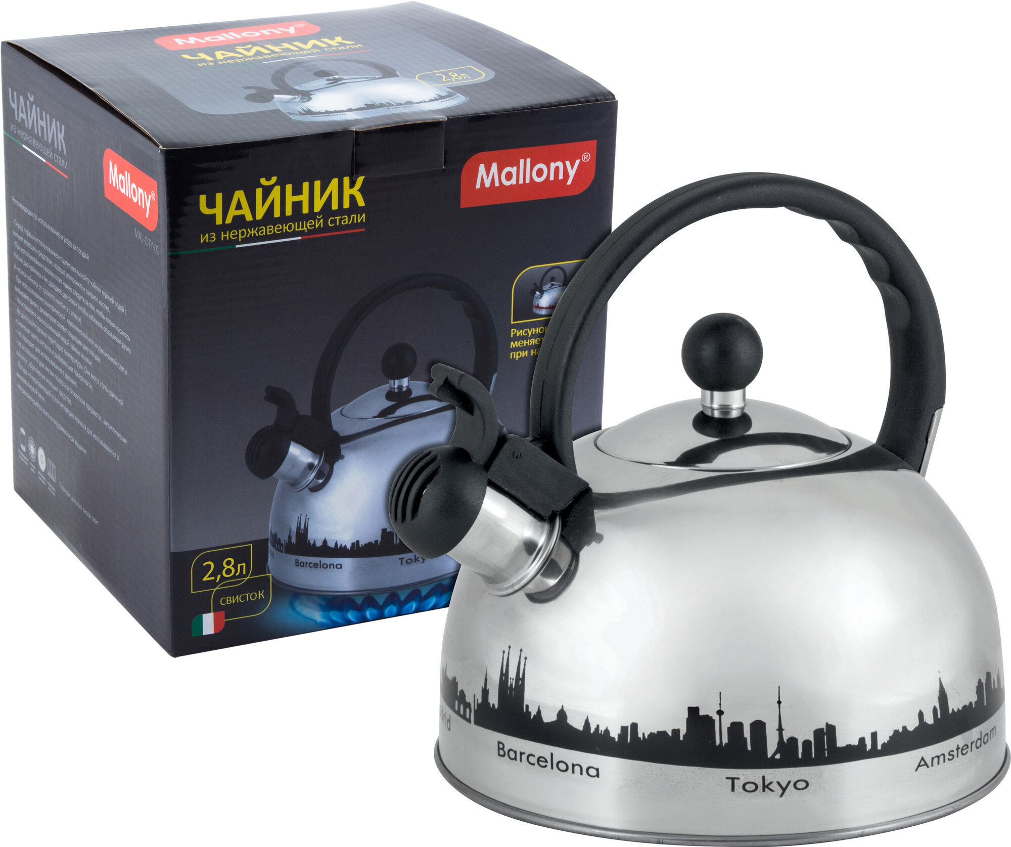 Купить Чайник из нержавеющей стали 2,8 л со свистком, с рисунком, меняющим цвет MAL-CITY-01