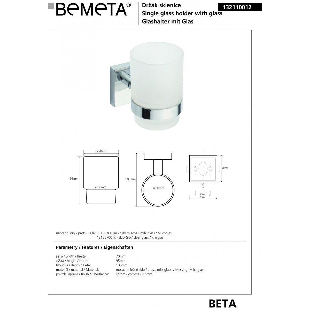 Стакан Bemeta Beta 70х130х95 мм 132110012