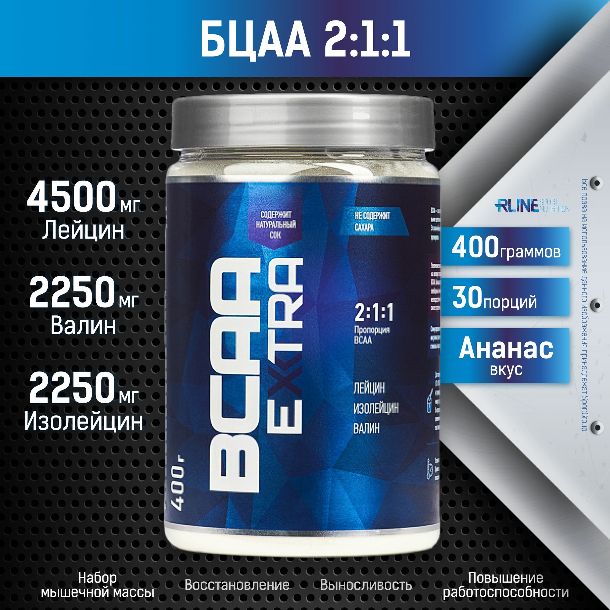 Аминокислоты БЦАА RLINE BCAA Extra 2:1:1, Ананас, 400 г