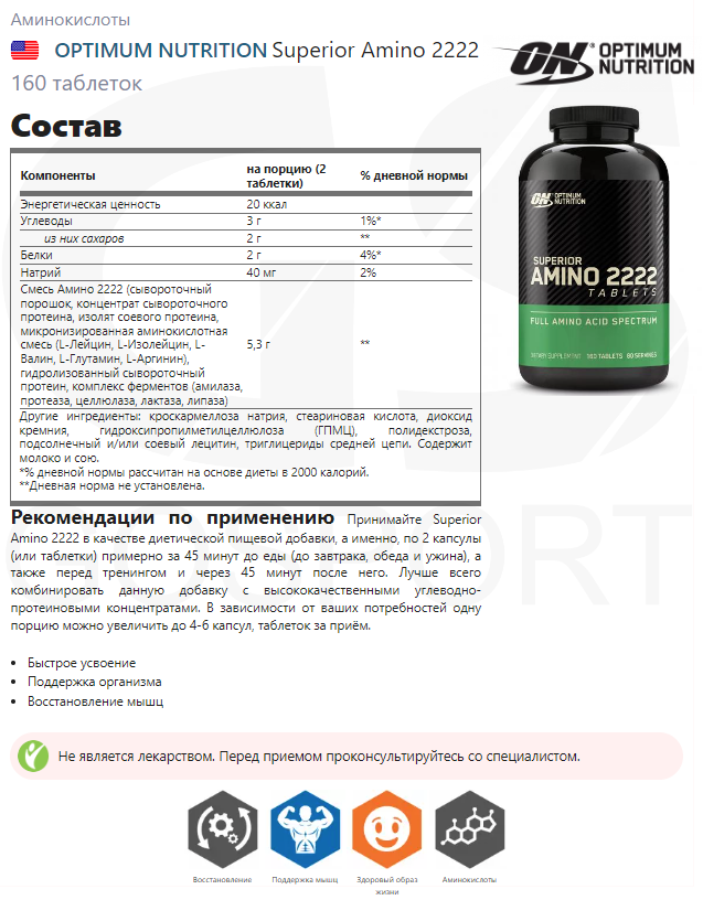 Ниже Вы можете прочитать отзывы на Superior Amino 2222 - 160 табл. (Optimum Nutrition), ознакомится с подробными характеристиками, посмотреть интересные обзоры и фотографии на Superior Amino 2222 - 160 табл. (Optimum Nutrition).