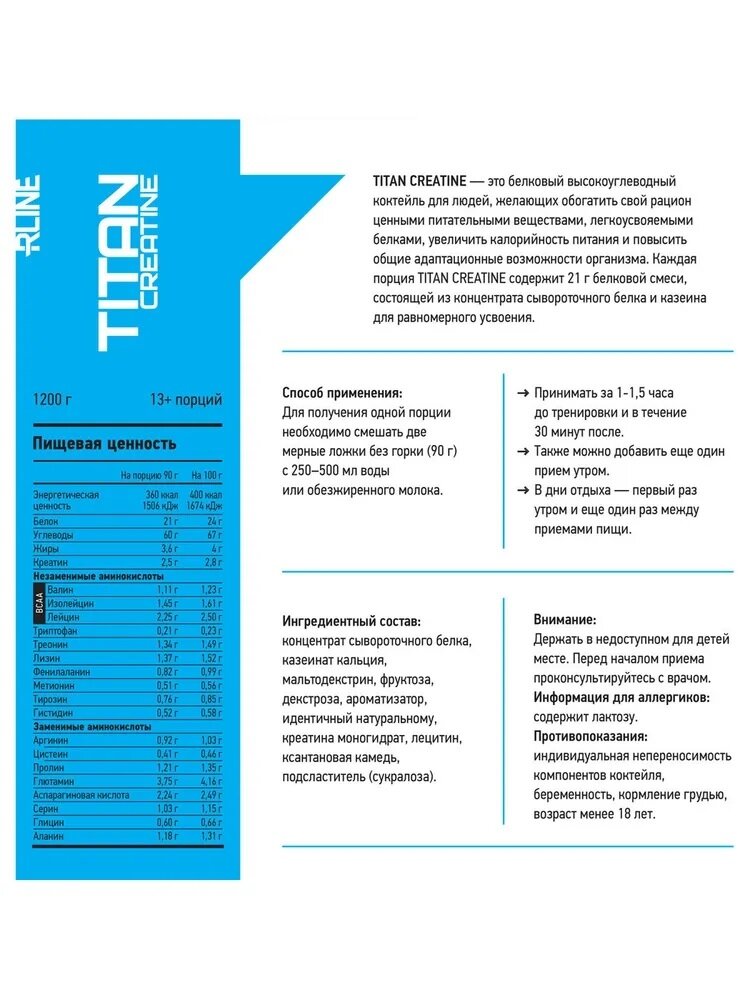 Гейнер Rline Titan Creatine, ваниль, 4000 гр