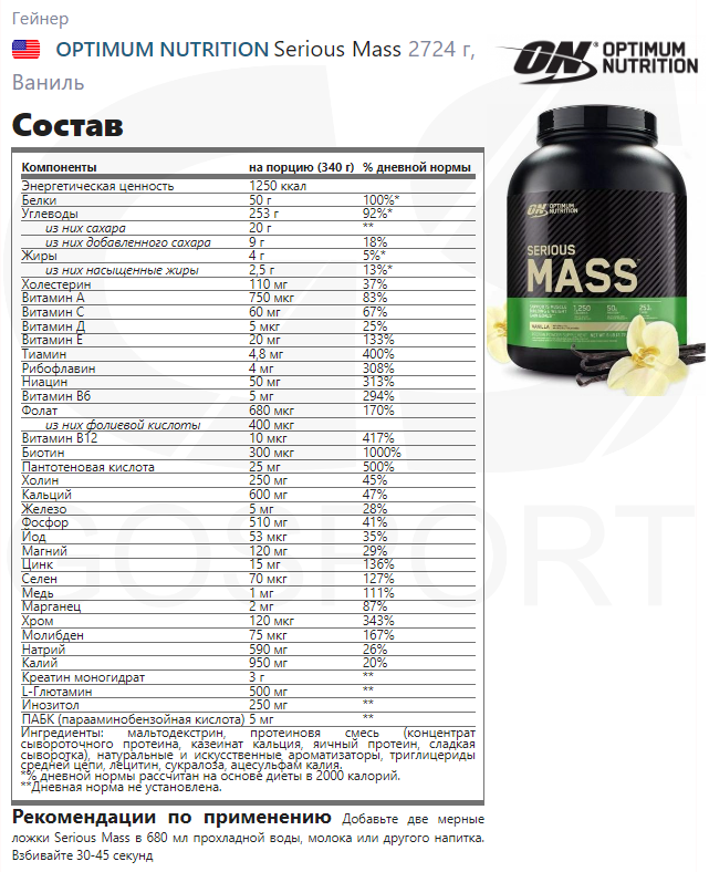 Ниже Вы можете прочитать отзывы на Serious Mass 2720 гр. 6lb (Optimum Nutrition) Ваниль, ознакомится с подробными характеристиками, посмотреть интересные обзоры и фотографии на Serious Mass 2720 гр. 6lb (Optimum Nutrition) Ваниль.