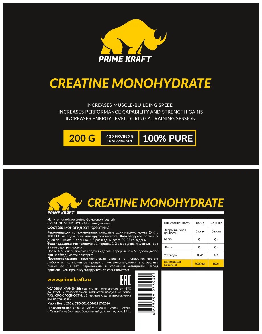 Купить Креатин Prime Kraft, моногидрат, без добавок, 200 гр, 40 порций