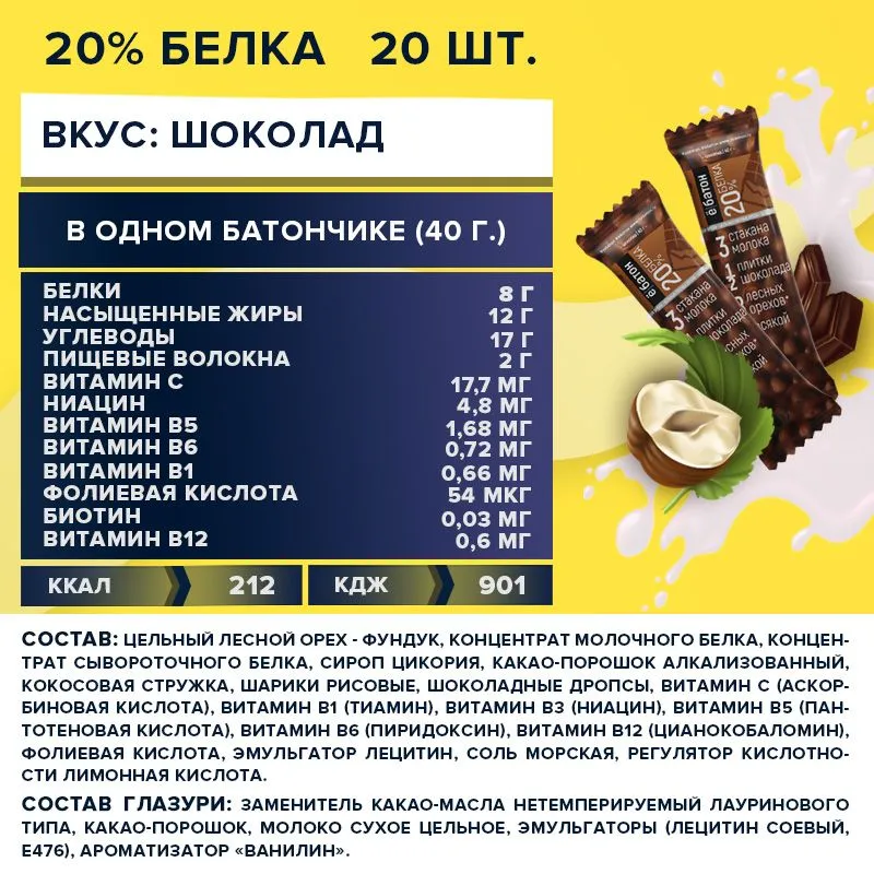 | Отзыв: | Какие 3 стакана молока?! Это обман. В одном батончике в 50 гр. около 10 гр. протеина, а это от силы 1-1.5 стакана. Да и белок не самого лучшего качества. |