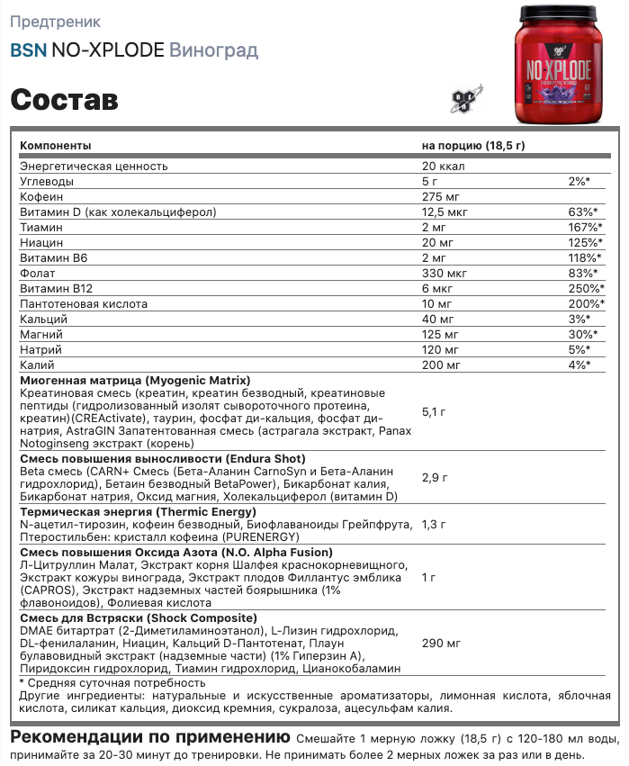 Ниже Вы можете прочитать отзывы на Предтренировочный комплекс N.O.-Xplode New Formula 3.3 1110 гр 2.45lb (BSN) Виноград, ознакомится с подробными характеристиками, посмотреть интересные обзоры и фотографии на Предтренировочный комплекс N.O.-Xplode New Formula 3.3 1110 гр 2.45lb (BSN) Виноград.