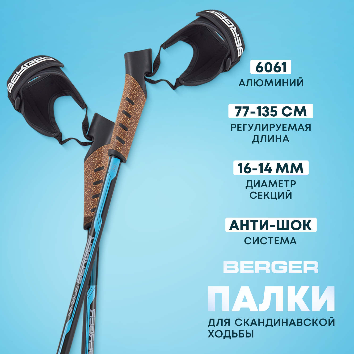 Купить Скандинавские палки Nimbus, 77-135 см, 2-секционные, черный/голубой, Berger - Без характеристики