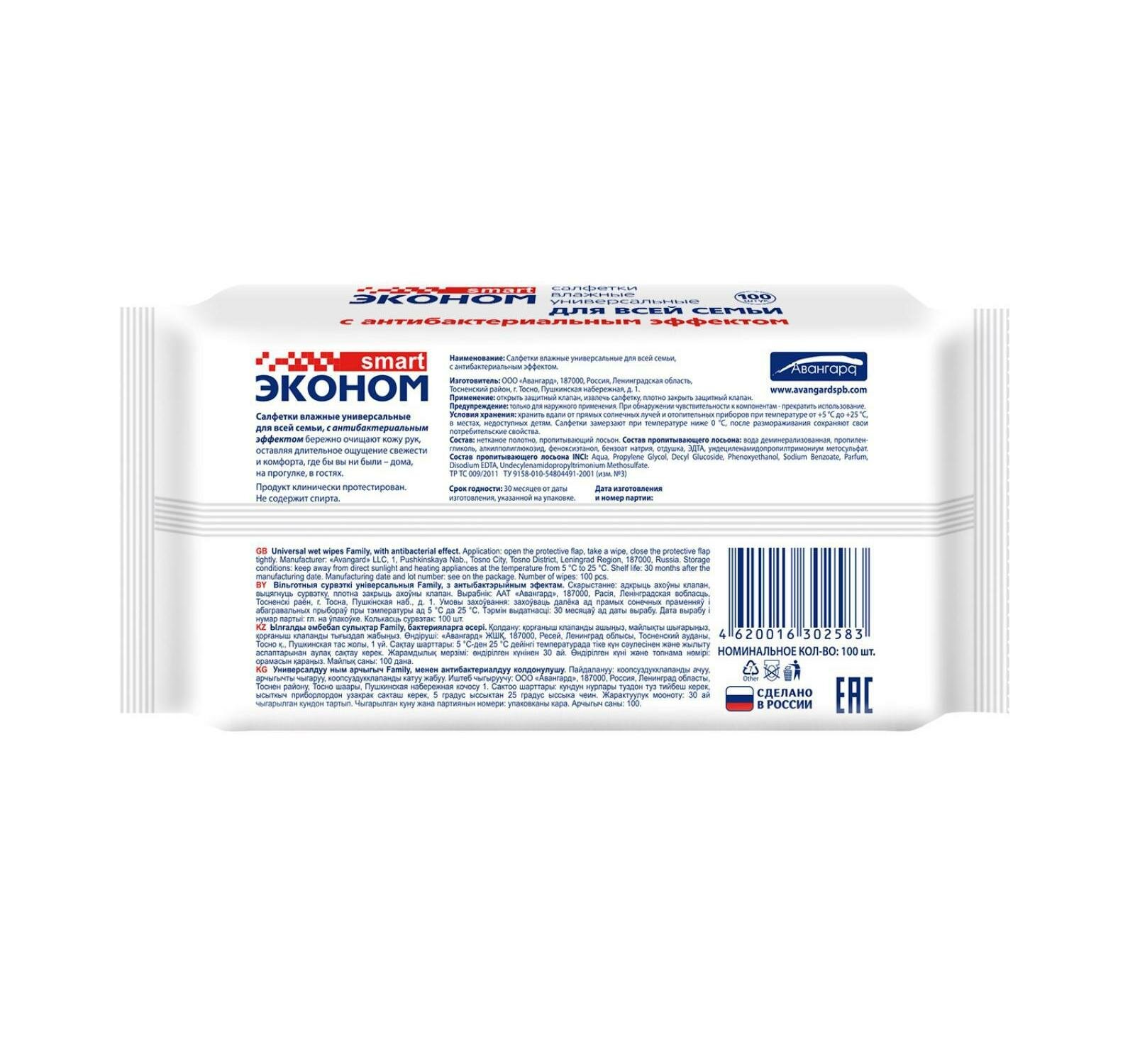 Салфетки влажные Эконом smart 100шт. для всей семьи с антиб.эфф.
