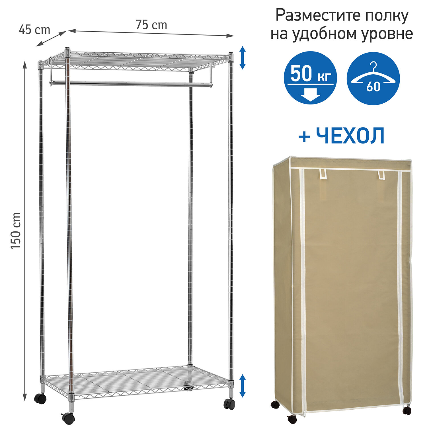 Art moon BUFFALO Сверхмощная стойка с двумя полками и штангой для вешалок, в комплекте с чехлом, Бежевый чехол