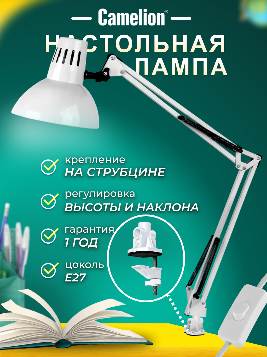 Светильник Camelion KD-312 C01 (5764) настольный, на струбцине, E27, белый, 60 Вт
