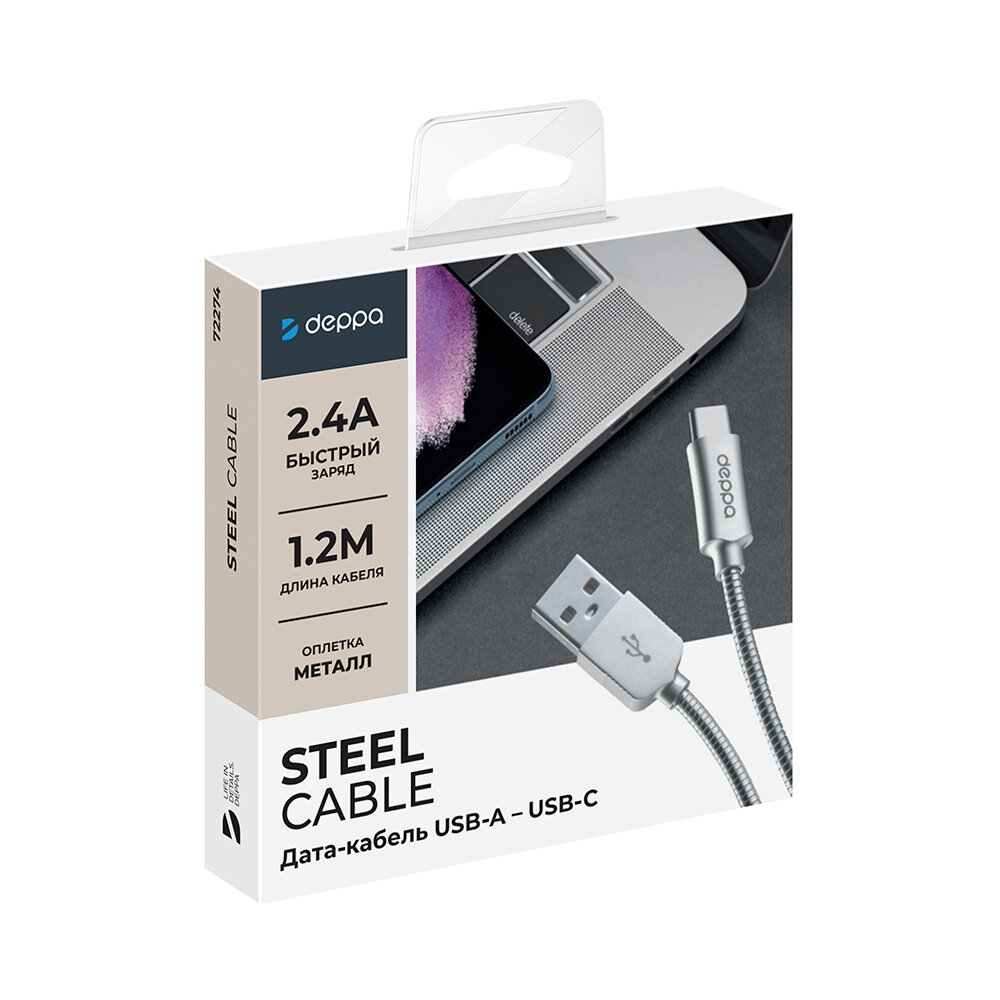Кабель Deppa Steel, USB Type-C (m) - USB (m), 1.2м, 2.4A, стальной [72274]