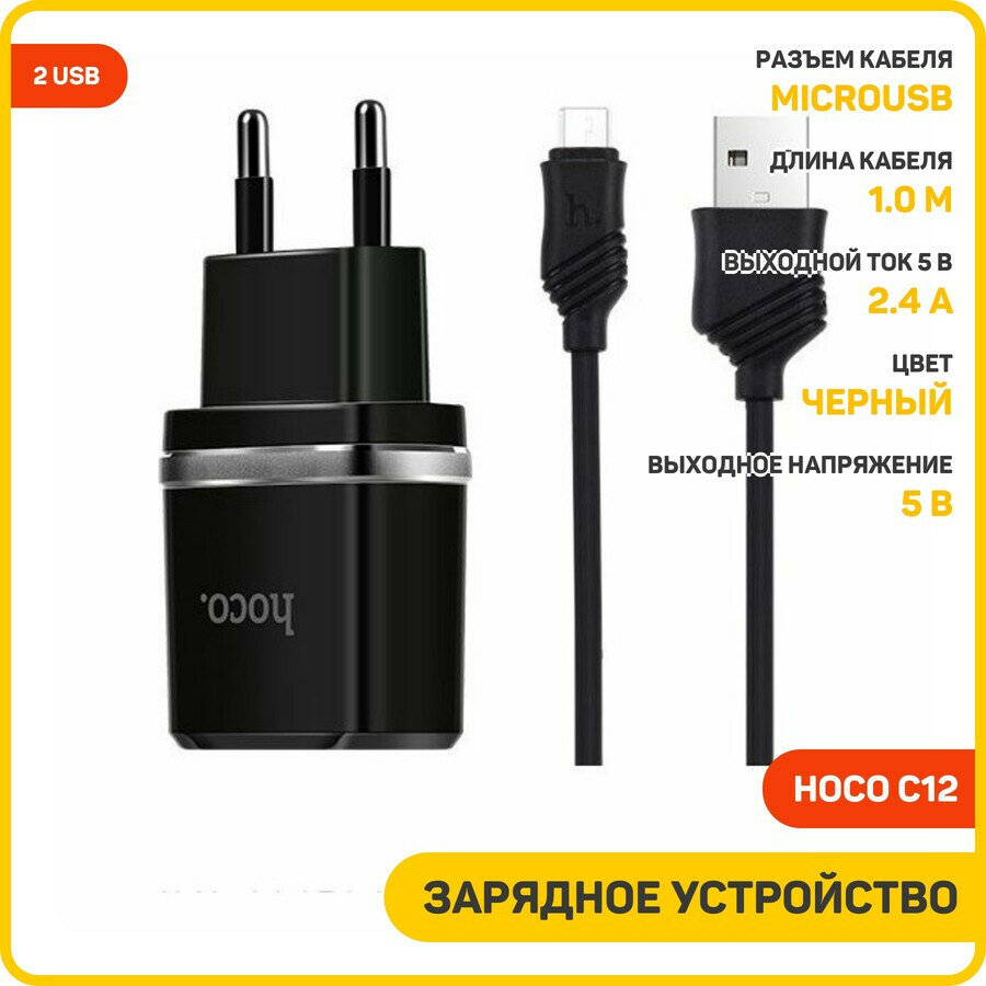 Зарядное устройство HOCO, C12 с кабелем micro-USB (2 USB/2.4 A), чёрное