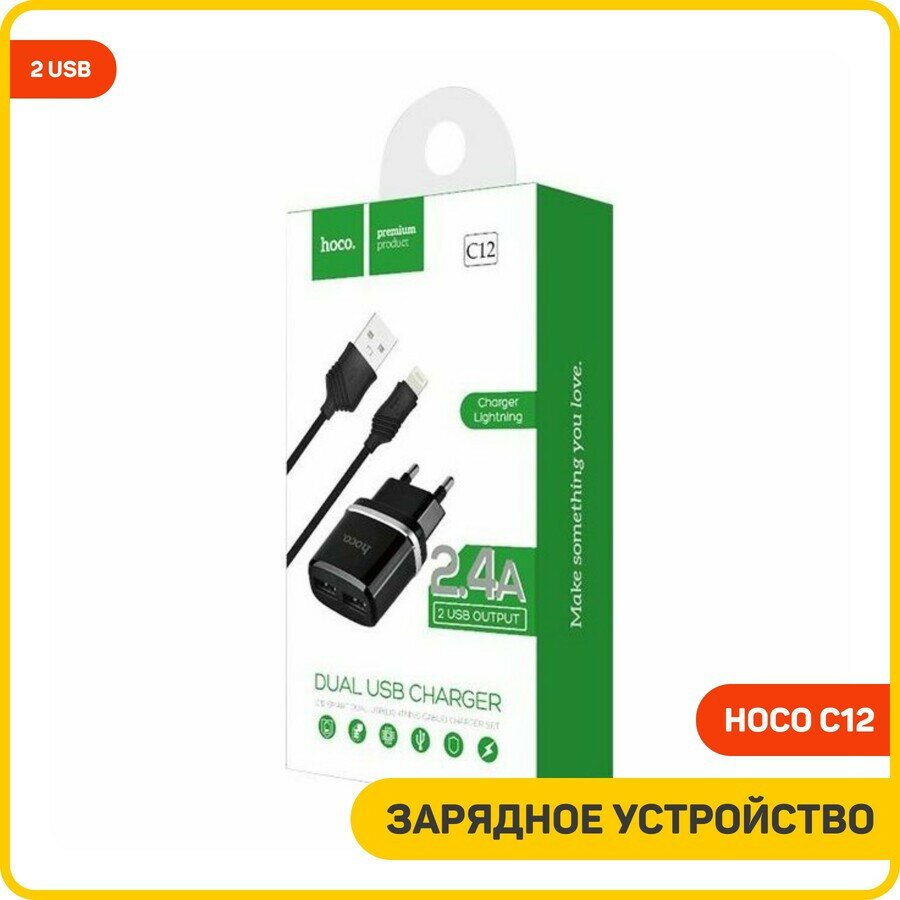 Сетевое зарядное устройство (СЗУ) Hoco C12 (2 USB) + кабель MicroUSB, 2.4 А, черный