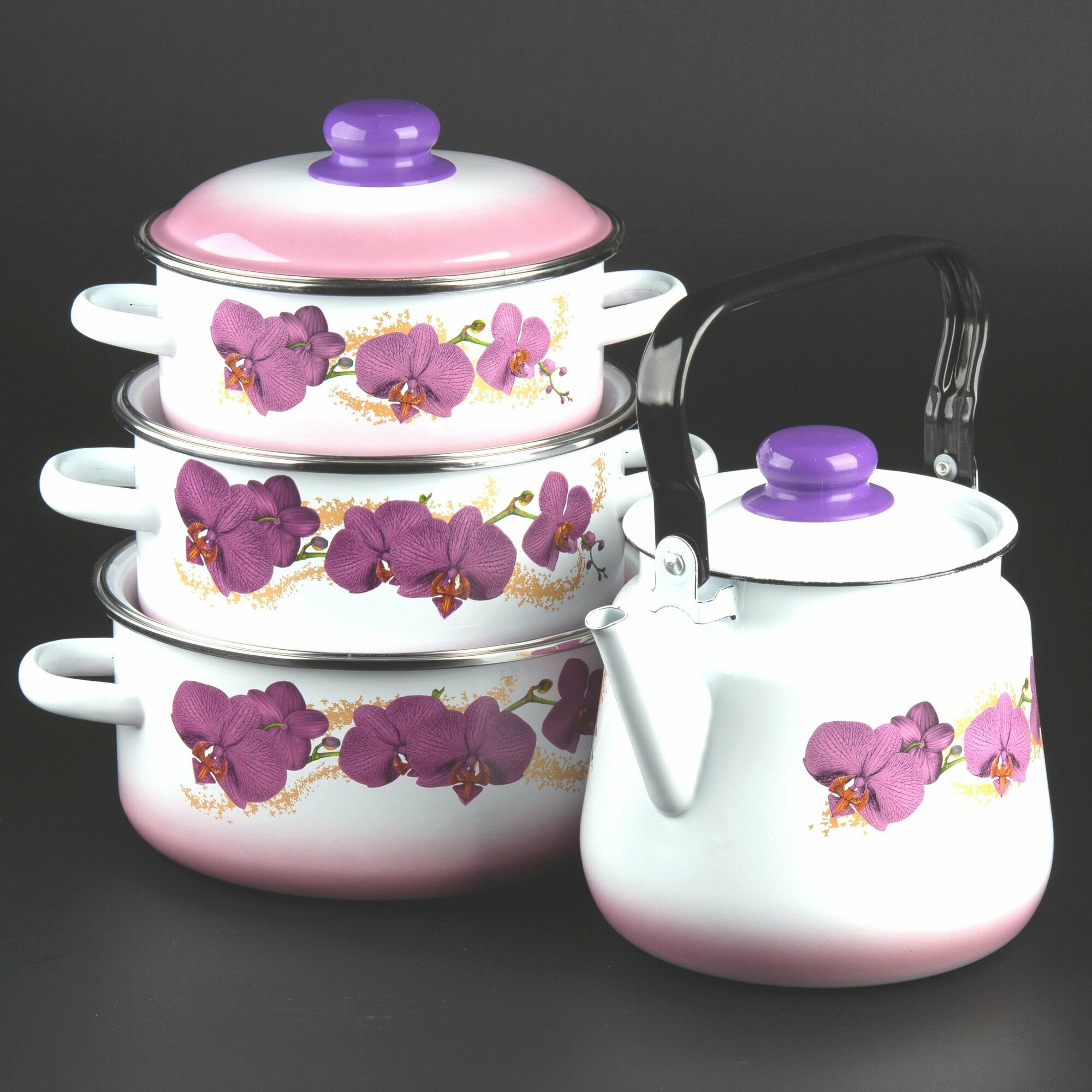 Купить Набор посуды СтальЭмаль №31 Орхидея 5КВ311М белосн к.2.0/3.0/4.0л, чайник