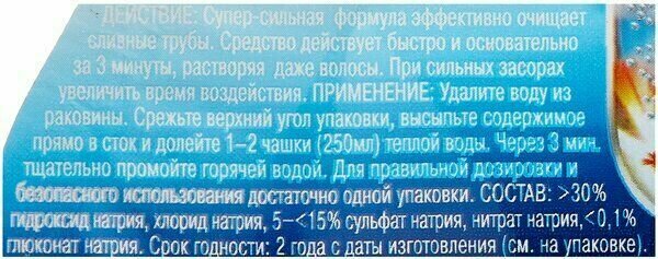 | Минусы: | Надо быть крайне осторожным в использовании, очень сильный запах при реакции с засором! И главное не передержать, может повредить пластиковый сифон. По инструкции 2 или 3 минуты и пролить обильно водой. |