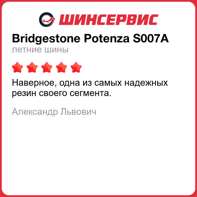 | Отзыв: | 245 /40 R19, город, трасса. Очень нравится S007 за сцепные свойства, и за надежность (боковина двухслойная, что по сути делает эту шину практически неубиваемой) |