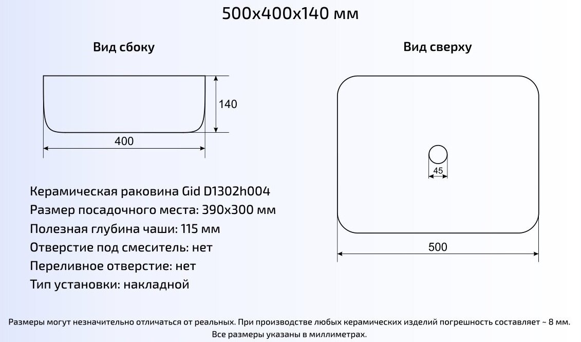 Накладная раковина серая 50x40х14 см, Gid, Gm1302