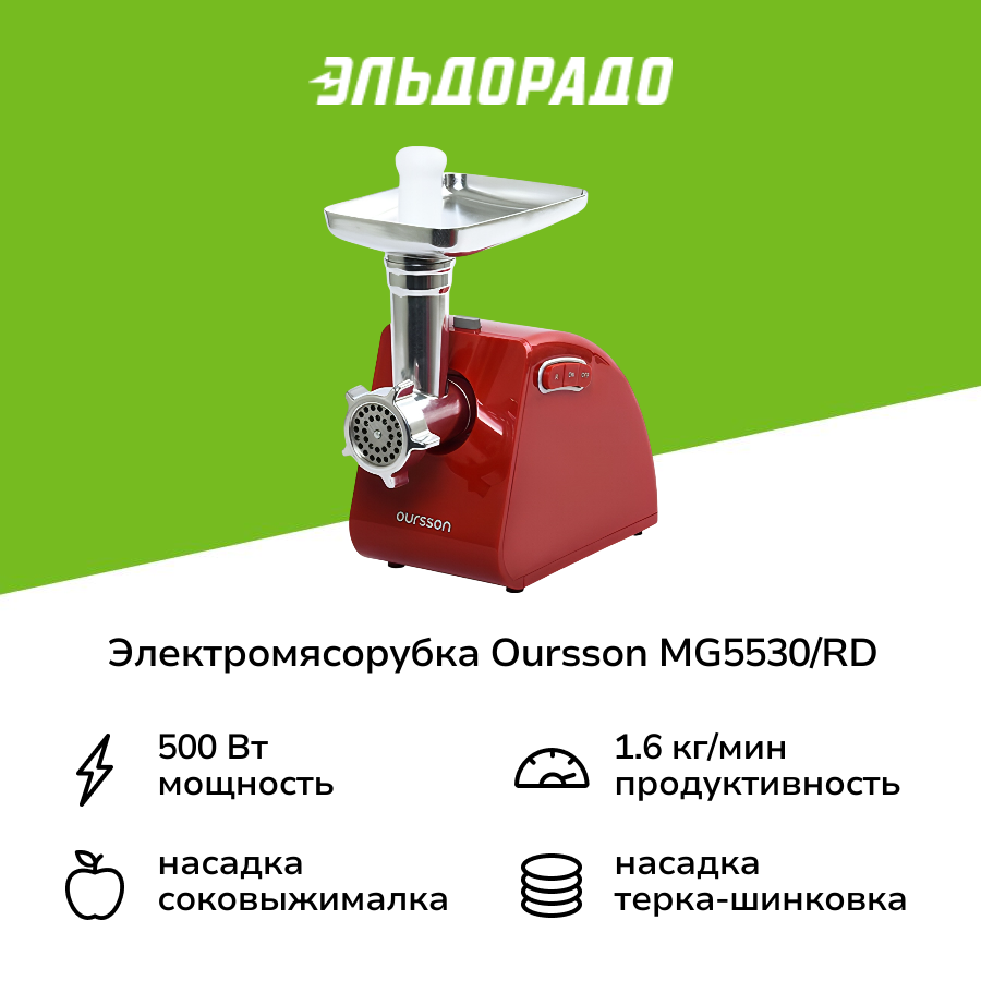 Мясорубки Oursson Мясорубка электрическая Oursson MG5530/RD, 500 Вт, 1.6 кг/ч, реверс, красный