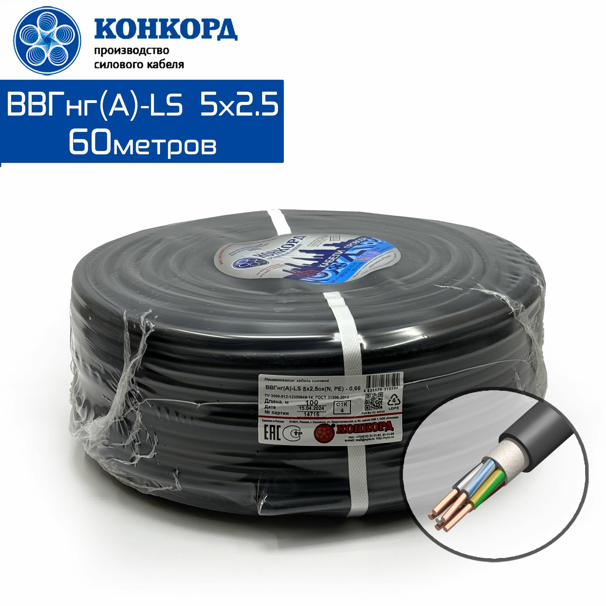 СохранитьСиловой кабель ВВГнг(A)-LS 5х2.5 60метров Конкорд ГОСТ интересное: