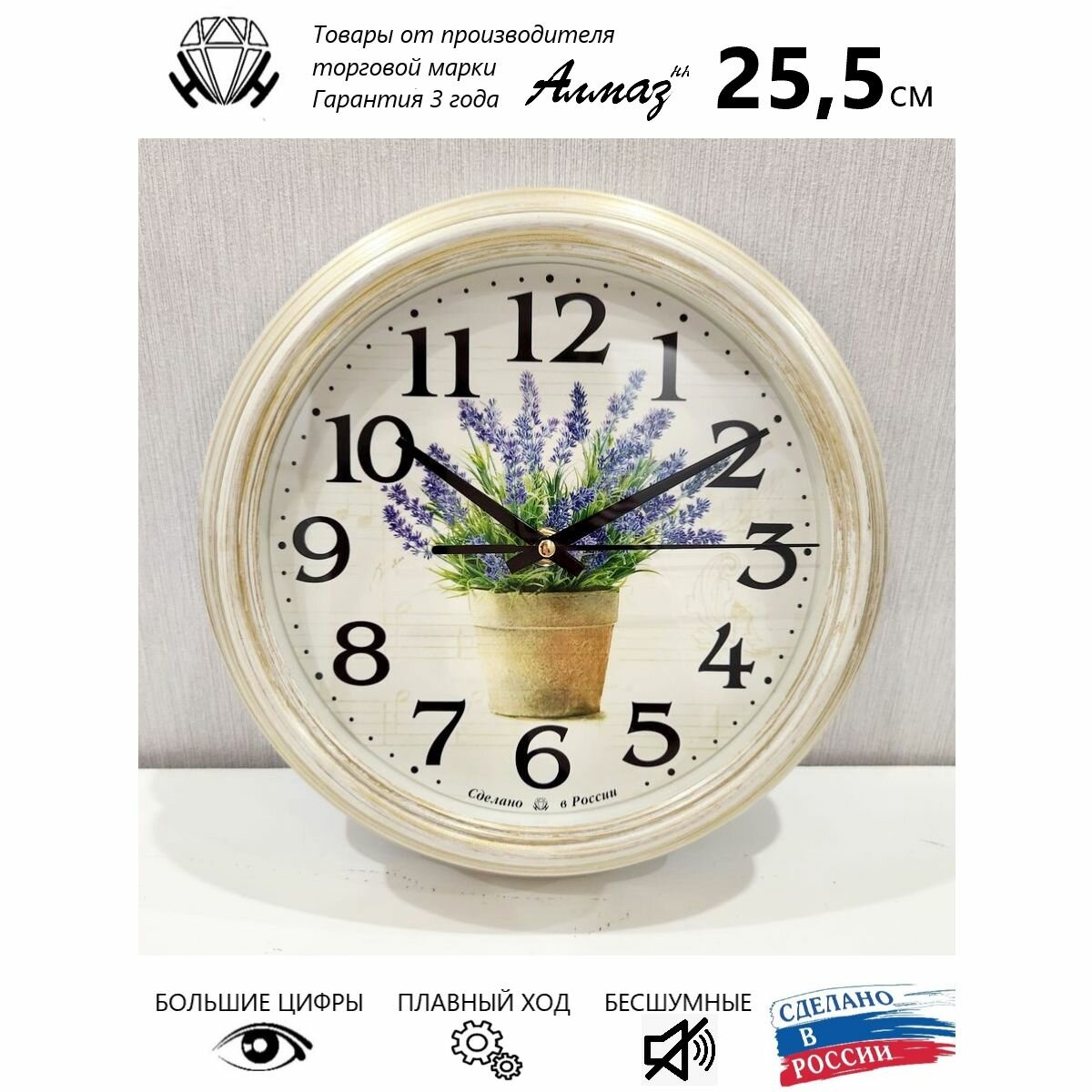 Часы настенные АлмазНН диаметр 25.5 см бесшумные с крупными цифрами C31 интересное: