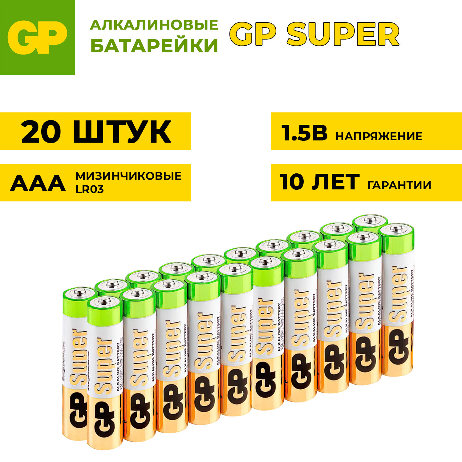 Батарейки алкалиновые 20 шт GP Super AAA (LR03, 24А) мизинчиковые, 1 упаковка