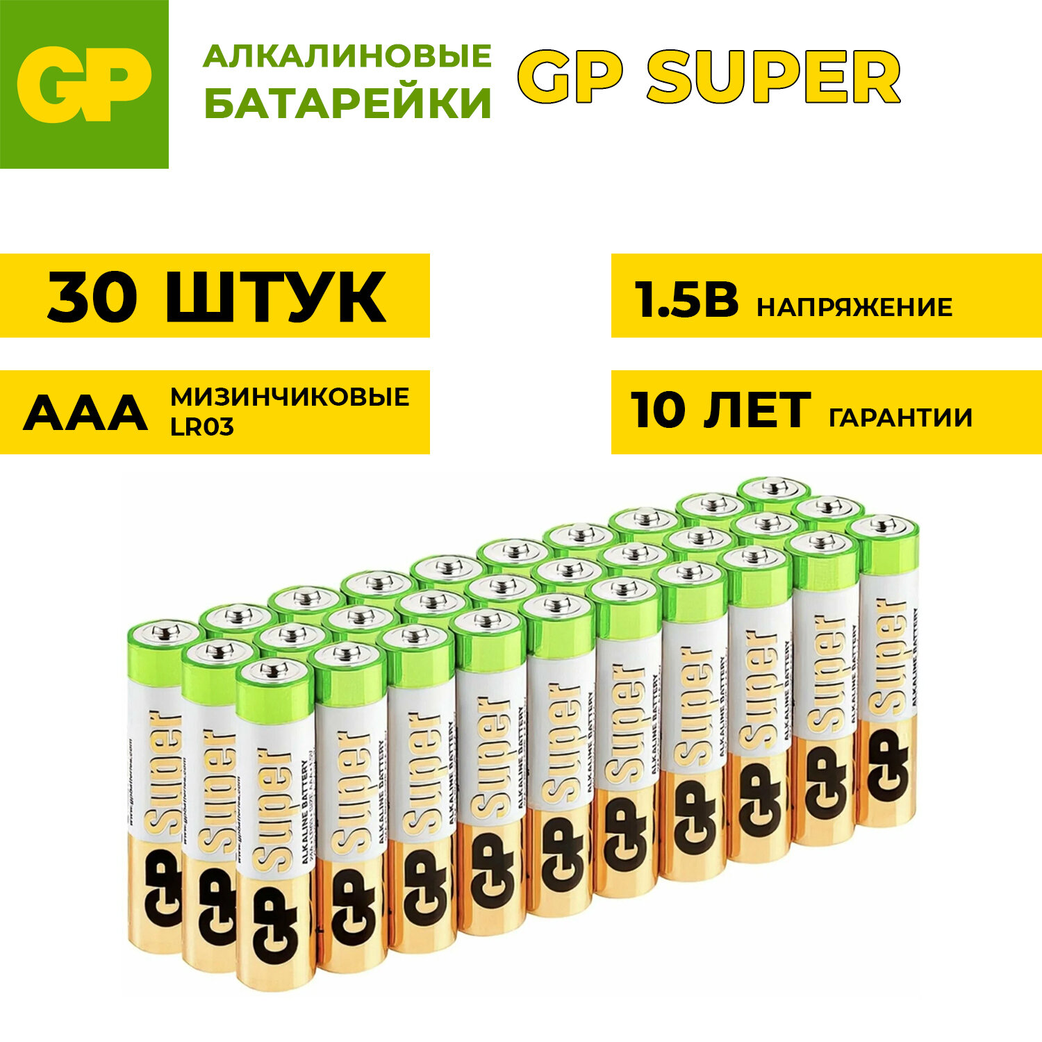 Купить 30 батареек AAA GP Super Alkaline 24A-B10 24A LR03, в пленке, мизинчиковые