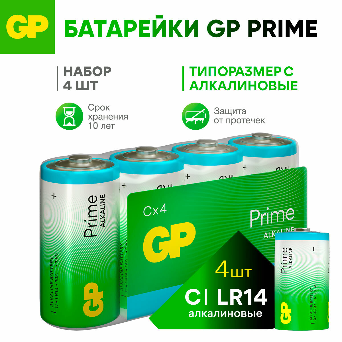 Купить GP Батарейки С алкалиновые щелочные Prime Alkaline, набор 4 шт
