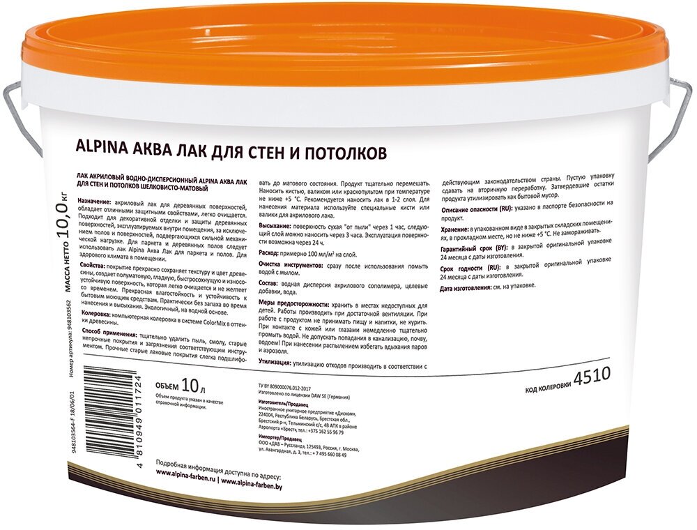Диском Лак паркетный Alpina Аква, акриловый, глянцевый, 10 л