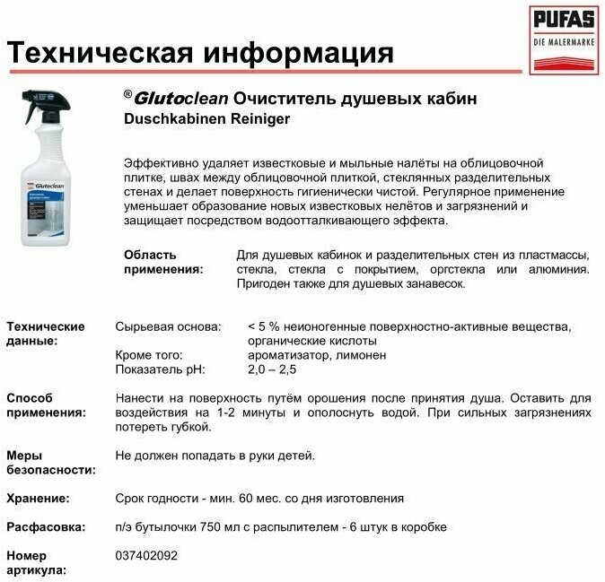 Очиститель для душевых кабин, Pufas Glutoclean, 750 мл.для удаления известковых и мыльных налетов на облицовочной плитке, швах между плиткой, стеклянных разделительных стенах и душевых занавесках.