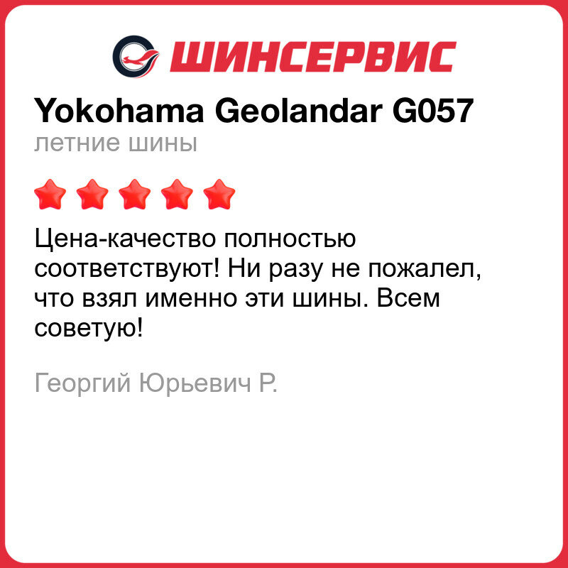 | Отзыв: | Yokohama Geolandar X-CV G057 хороший выбор для полного привода. Универсальные шины для универсальных машин, я бы сказал)) скоростные и нагрузочные характеристики заявлены нормальные, особо отмечу асимметричный протектор (воду отводят неплохо), Yokohama Geolandar X-CV G057 наверное одна из самых интересных новинок этого летнего сезона) |