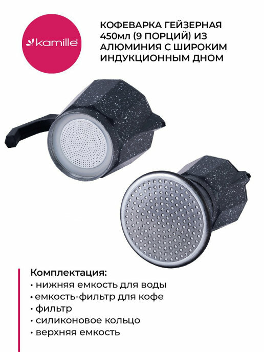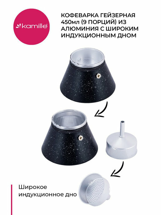 Кофеварка гейзерная 450 мл. Kamille КМ-2513MR (9 порций) из алюминия с индукционным дном (0,45 л. / черный)