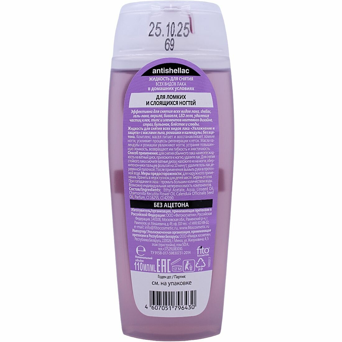 Жидкость для снятия гель-лака Fito Косметик, ANTISHELLAC увлажнение И защита, без ацетона с маслом льна, ромашки и календулы, (110 мл)