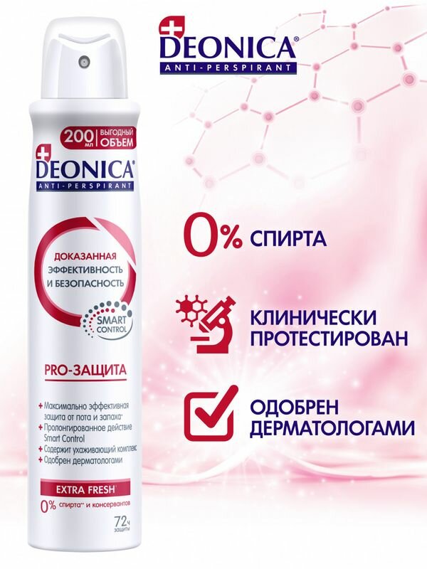 Антиперспирант Deonica "Антибактериальный эффект". Женский. Спрей, 200 мл. Пролонгированное действие Smart Control. Не оставляет следов на одежде