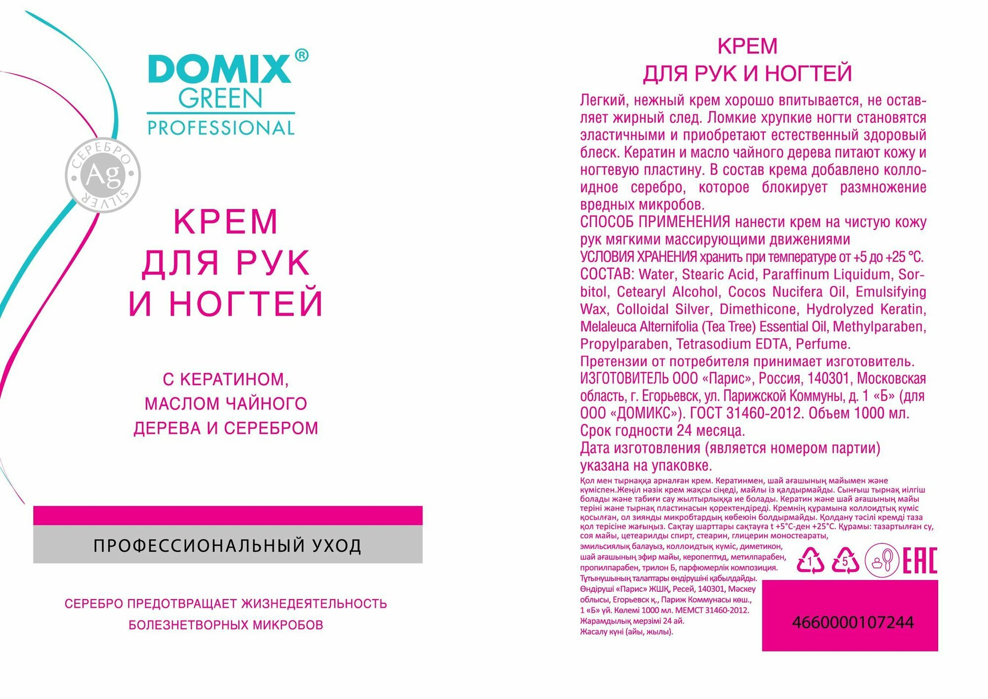 Domix Green Professional Крем для рук и ногтей с кератином, маслом чайного дерева и серебром