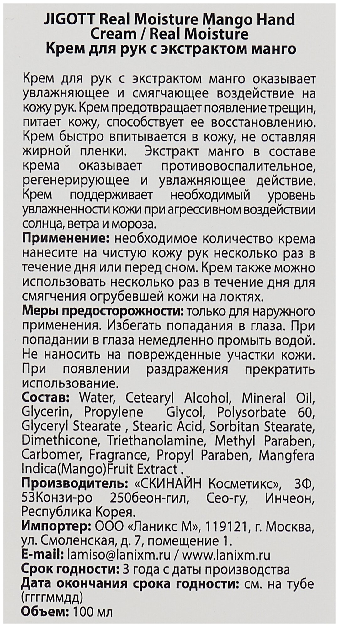 Купить JIGOTT Крем для рук с экстрактом манго. Real moisture mango hand cream, 100 мл.