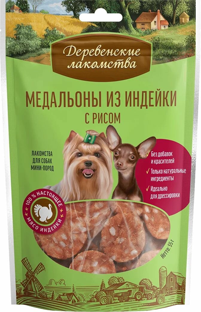 Деревенские лакомства 5шт х 55г медальоны из индейки с рисом для собак мини-пород