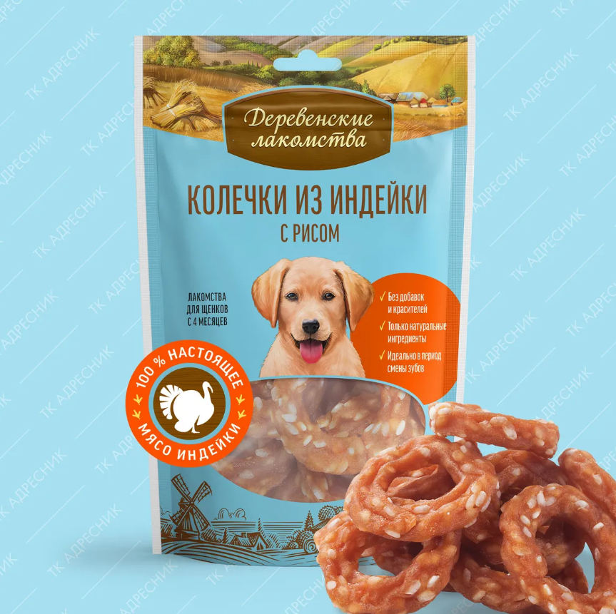 Деревенские лакомства "Колечки из индейки с рисом" для щенков пакет, 85 гр