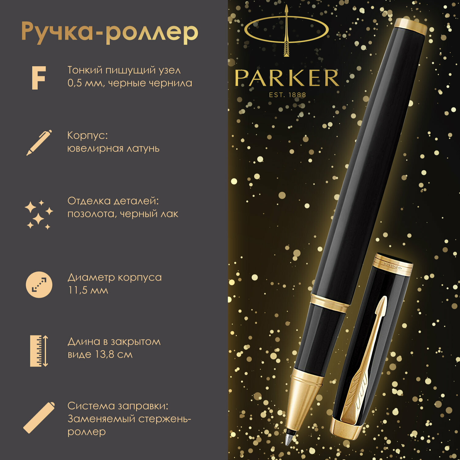 Ручка-роллер PARKER "IM Core Black Lacquer GT", черный глянцевый лак, позолота, черная, 1931659 В комплекте: 1шт.