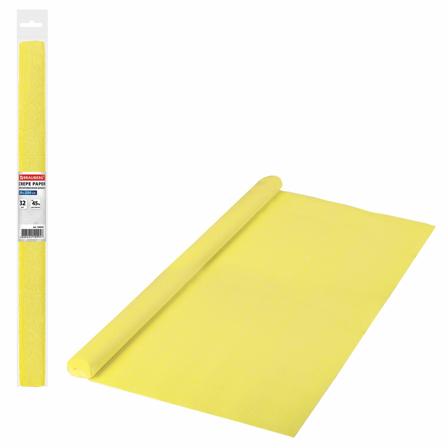 Бумага цветная крепированная Brauberg, 50x250см, плотная, растяжение до 45%, 32 г/кв.м, желтая, в рулоне, 1 лист (126529)