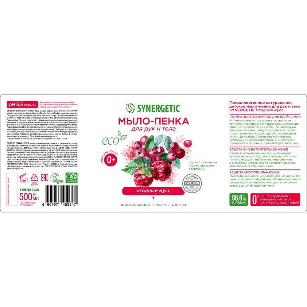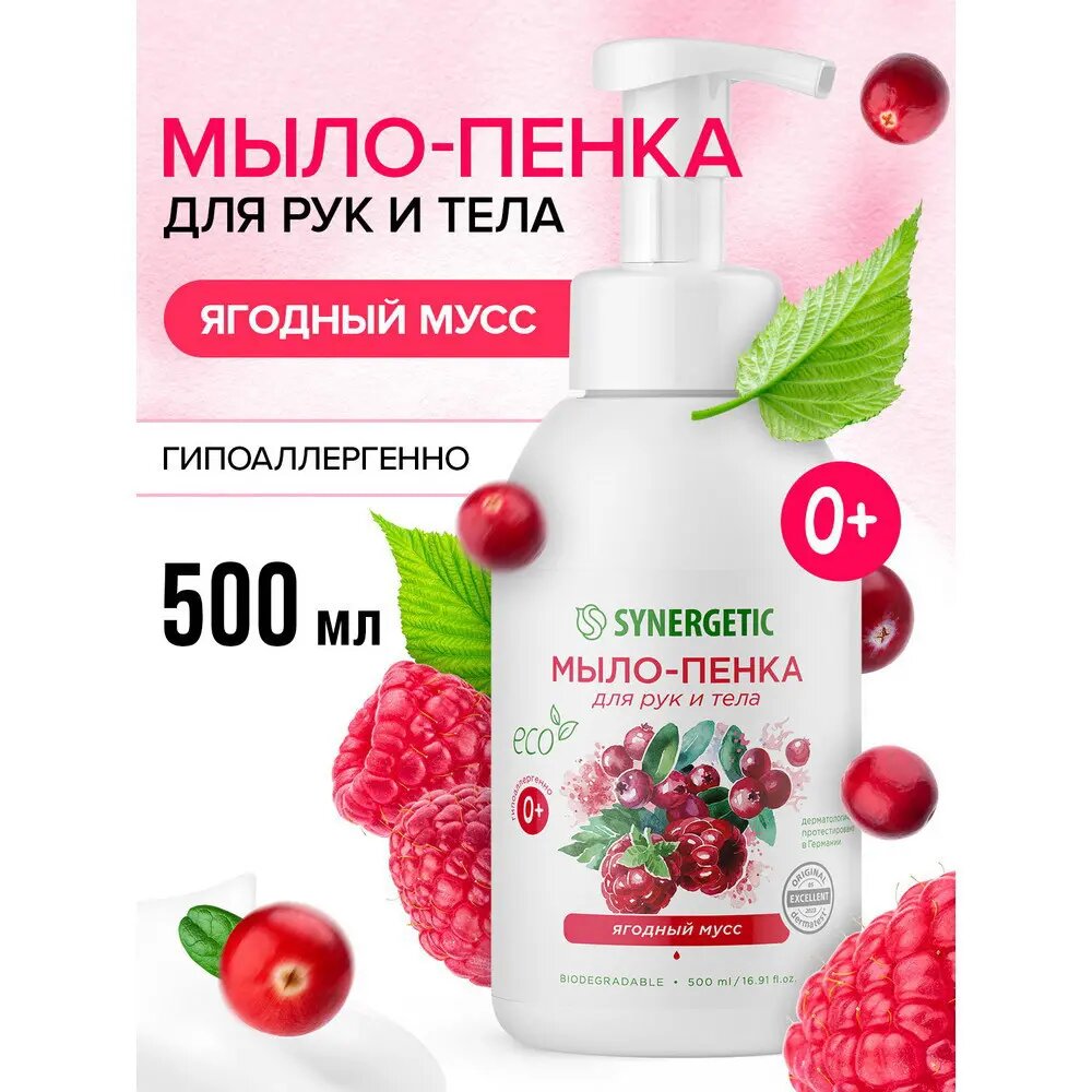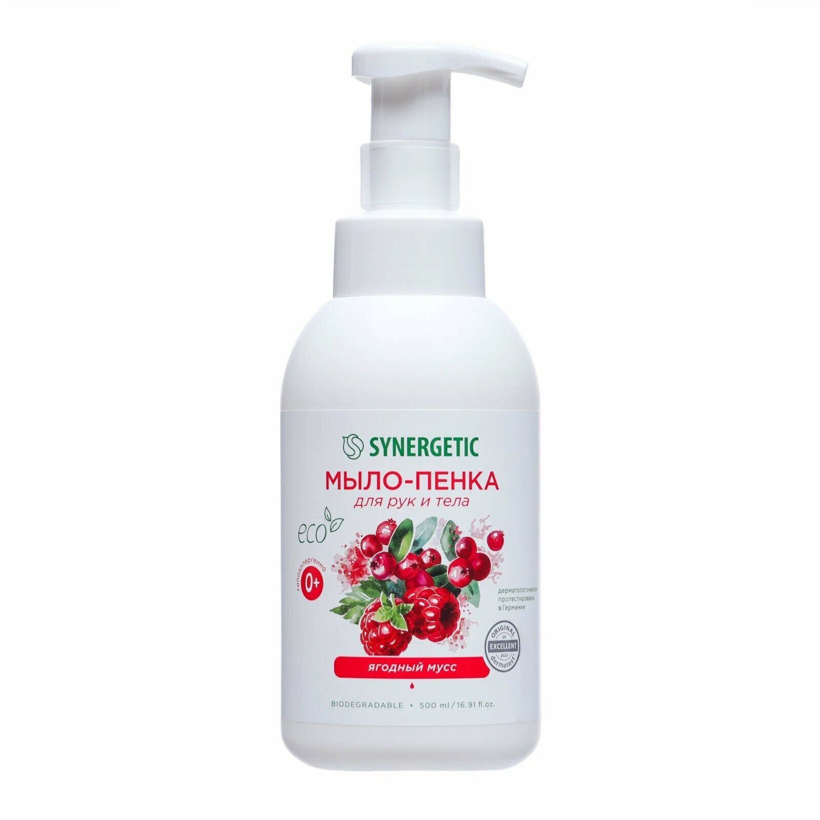 Мыло-пенка для рук и тела SYNERGETIC Ягодный мусс Гипоаллергенное натуральное детское 500 мл 4607971459347