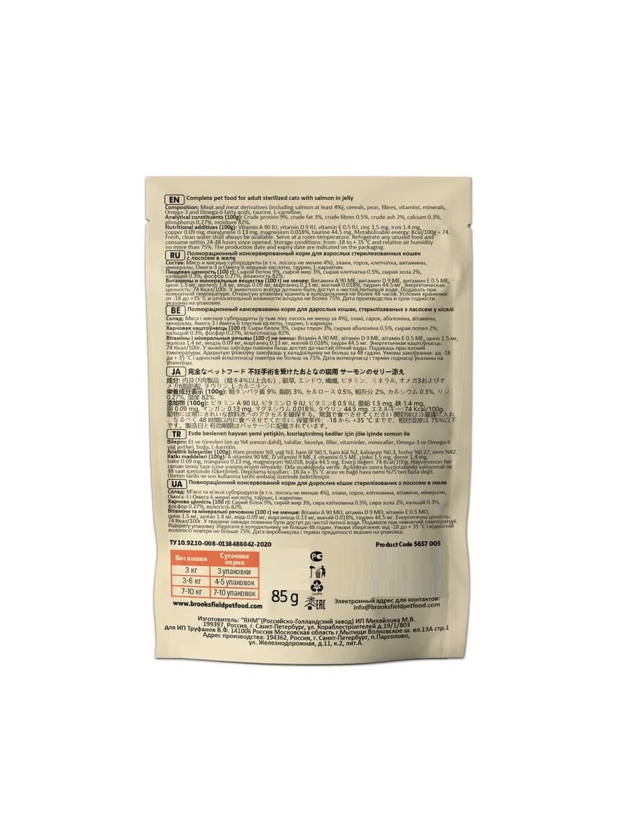 Купить Brooksfield Sterilized and Light Salmon пауч для стерилизованных кошек Лосось в желе 85г (22 шт)