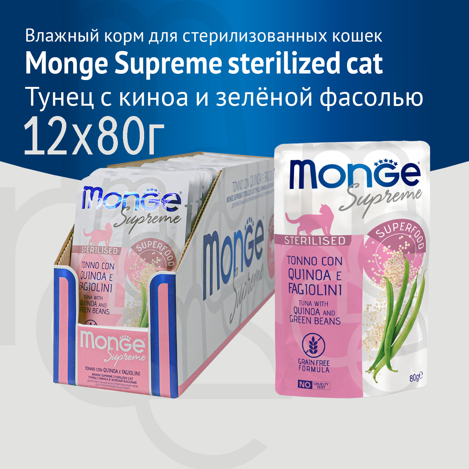 Влажный корм Monge Supreme sterilized cat для стерилизованных кошек из тунца с киноа и зелёной фасолью, паучи 80 г х 12шт.