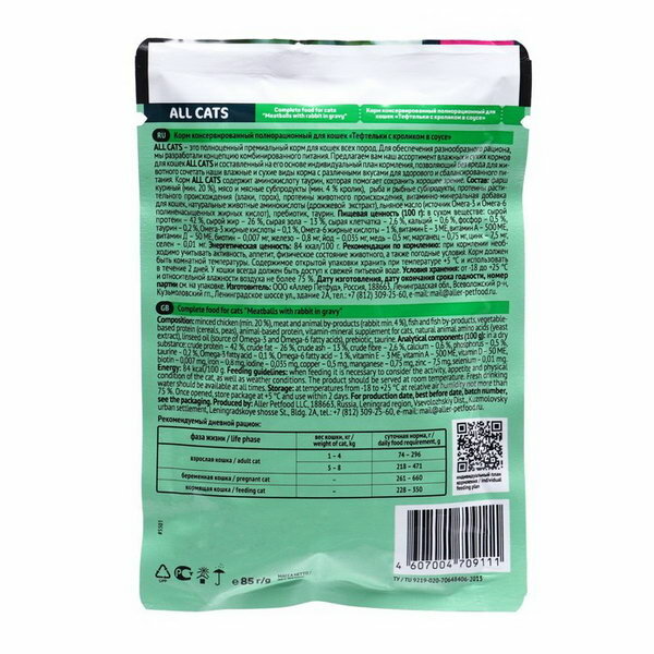 СохранитьКорм для кошек блок 28 штук*85 г ALL CATS тефтельки кролик в соусе/ Аллер Петфуд/Россия интересное: