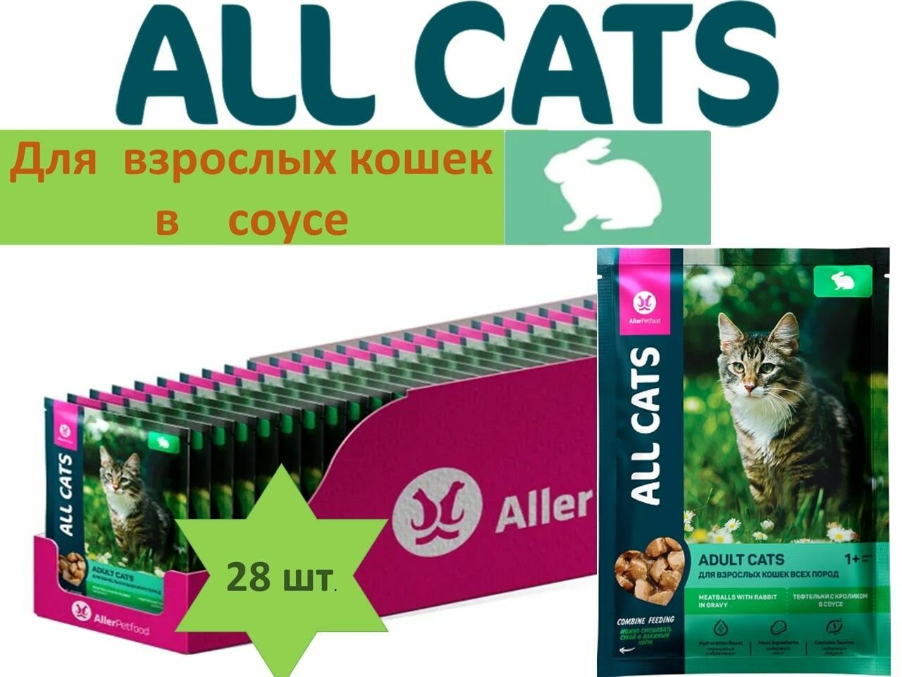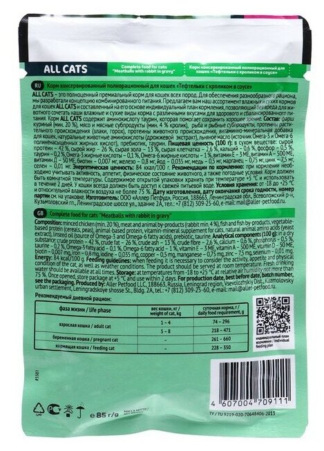 Купить Корм для кошек блок 28 штук*85 г ALL CATS тефтельки кролик в соусе/ Аллер Петфуд/Россия