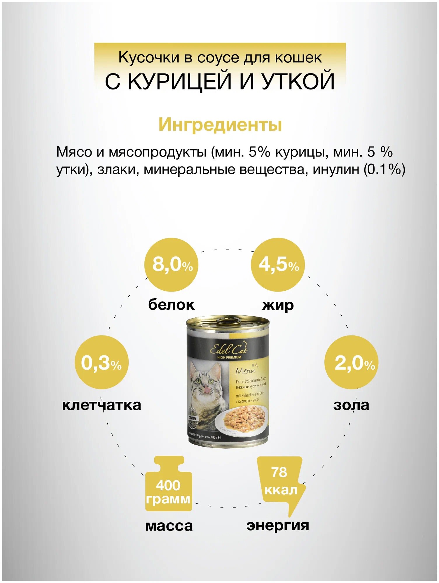 Влажный корм для кошек Edel Cat консервы нежные кусочки в соусе с курицей и уткой 0,4кг (12 шт)