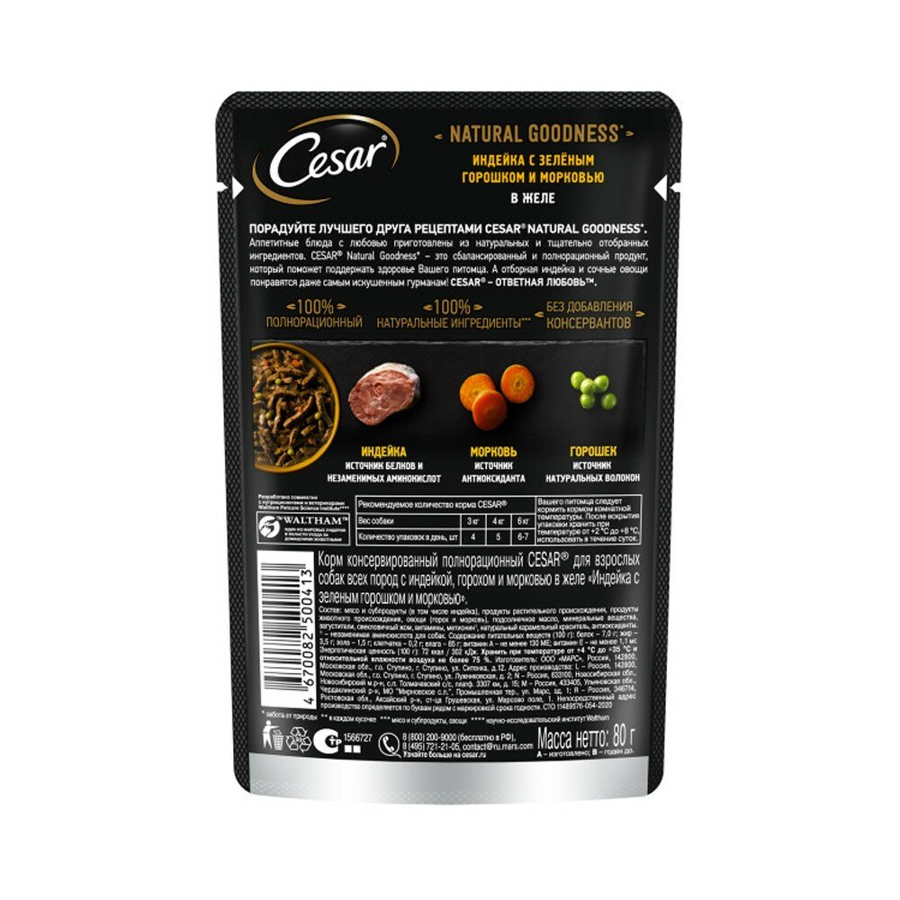 Влажный корм Cesar Natural Goodness для взрослых собак, с индейкой, горохом и морковью в желе, 56 шт по 80 г