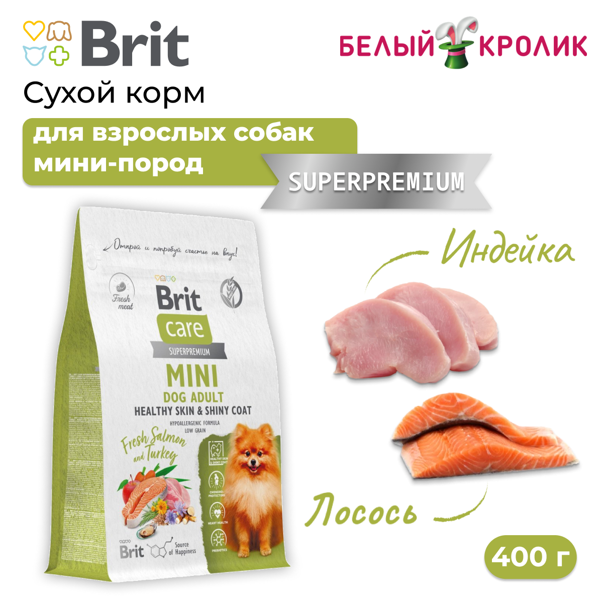 Brit Care (Брит Кэа) Adult Mini Skin & Coat Сухой корм для взрослых собак мелких пород для кожи и шерсти с индейкой 400 г