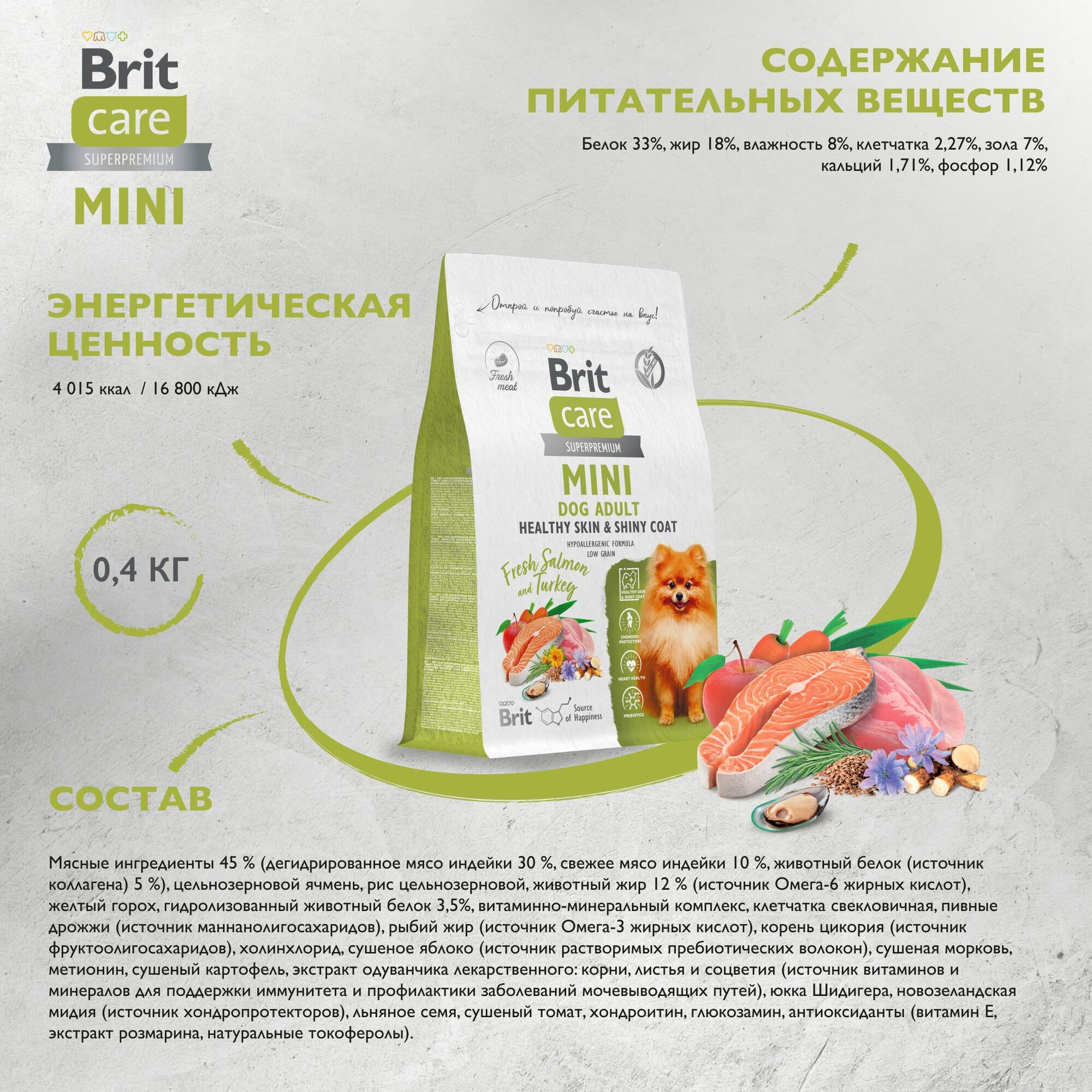 Купить Brit Care Mini Adult Healthy Skin&Shiny Coat сухой корм для взрослых собак мелких пород, с лососем и индейкой - 400 г