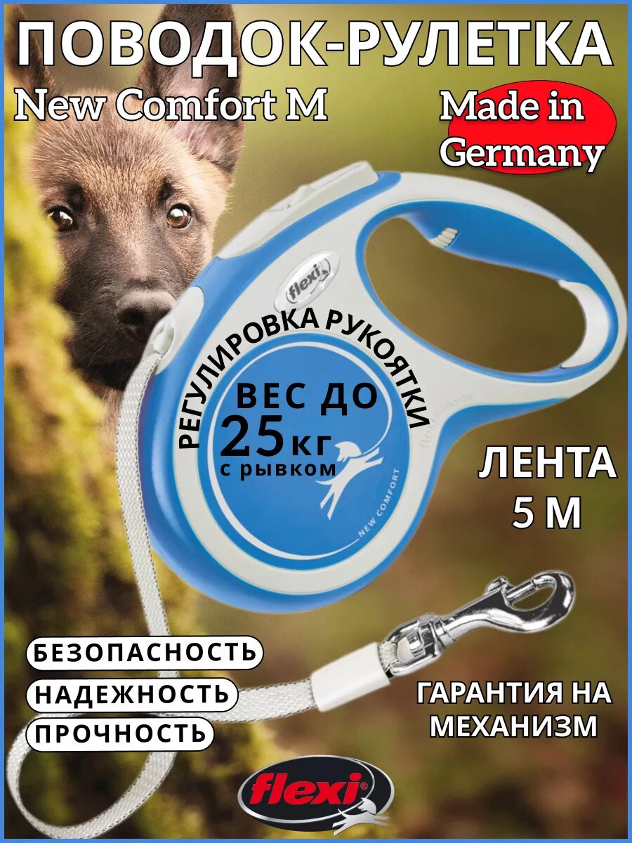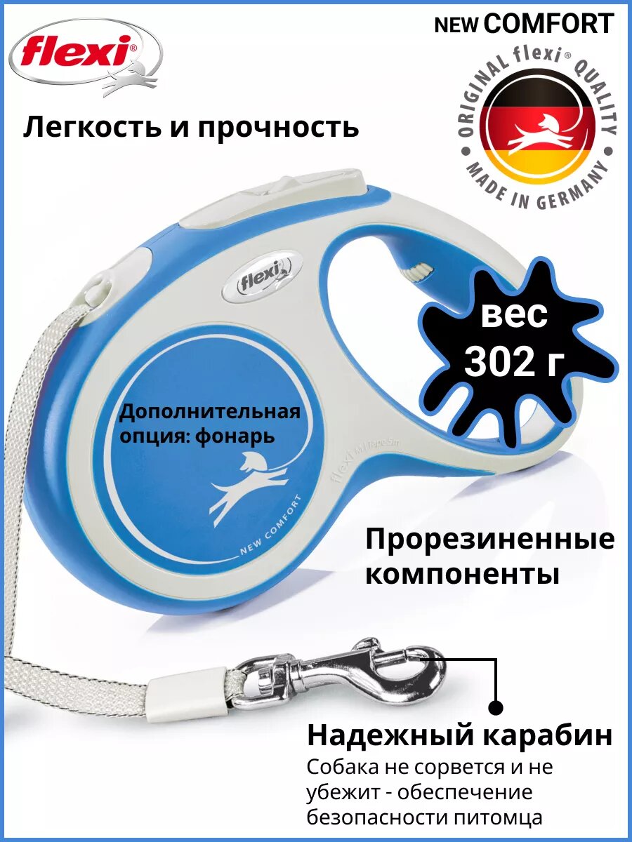 Flexi New Comfort tape M поводок-рулетка для собак, голубая 5 м, до 25 кг