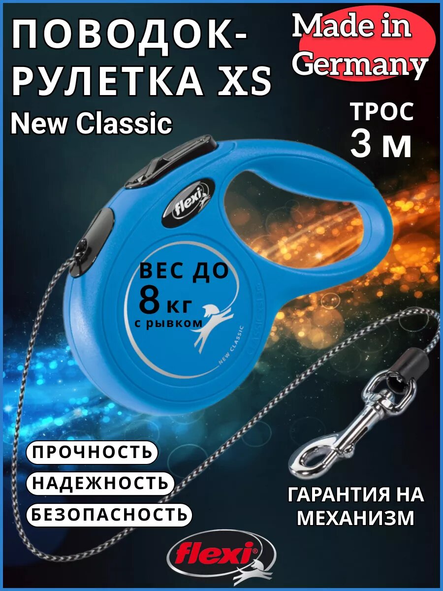 Поводок - рулетка для собак, кошек и других животных Flexi New Classic XS, трос, 3м, до 8кг, синяя
