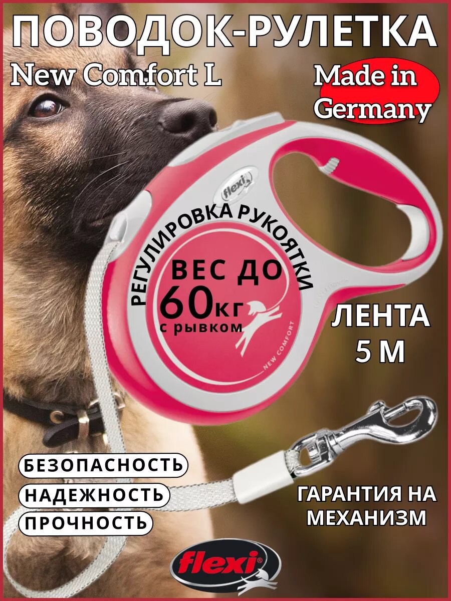 Рулетка-поводок Flexi New Comfort L, 5 м, 60 кг, лента, красный